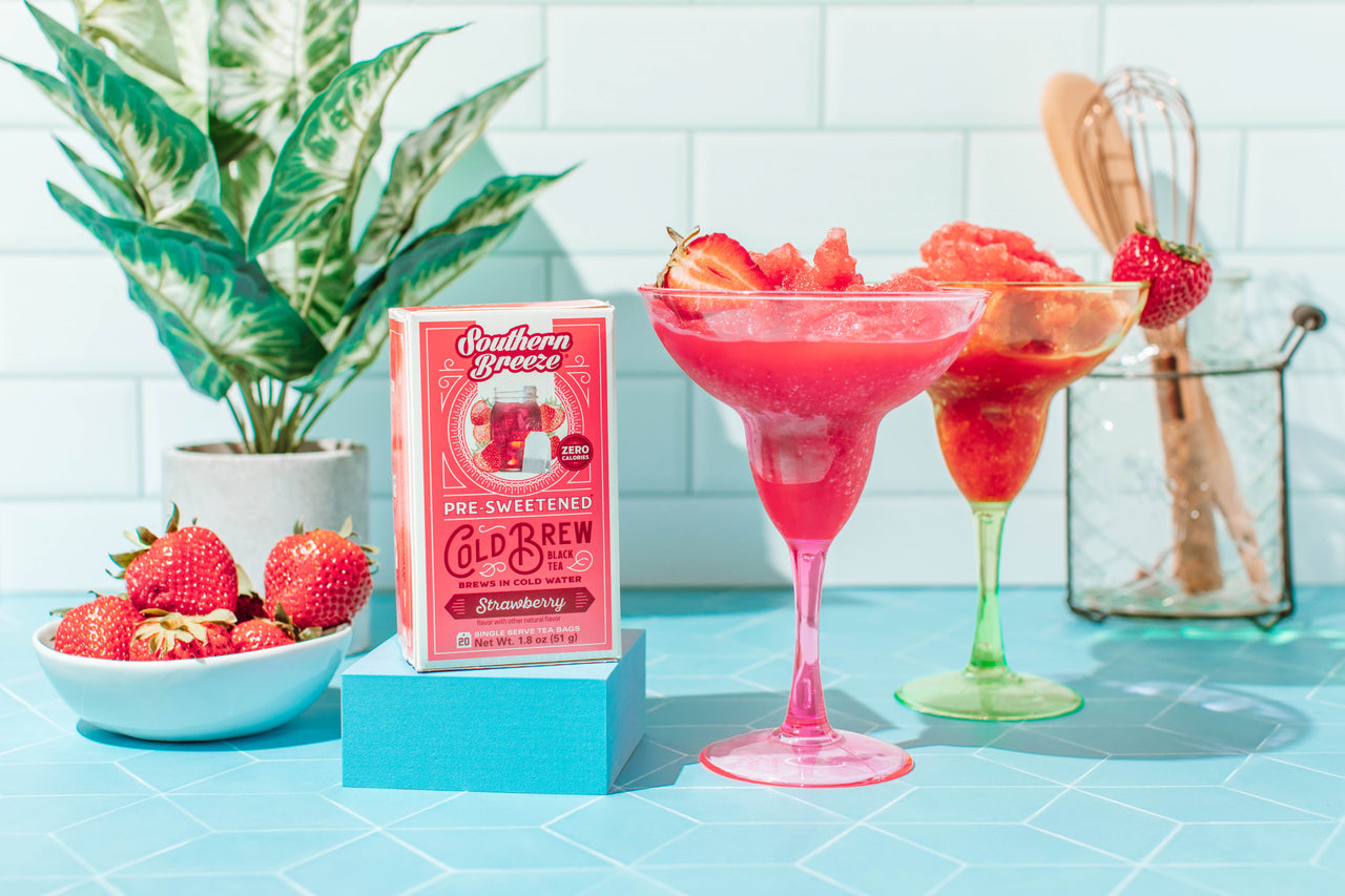 Southern Breeze Strawberry Cold Brew Sweet Iced Tea is sweet & summery perfection made with real tea leaves in a pre-sweetened bag-with no sugar, Sugar! So you can sip glass after guilt-free glass. Zero calories, meet heavenly hospitality!